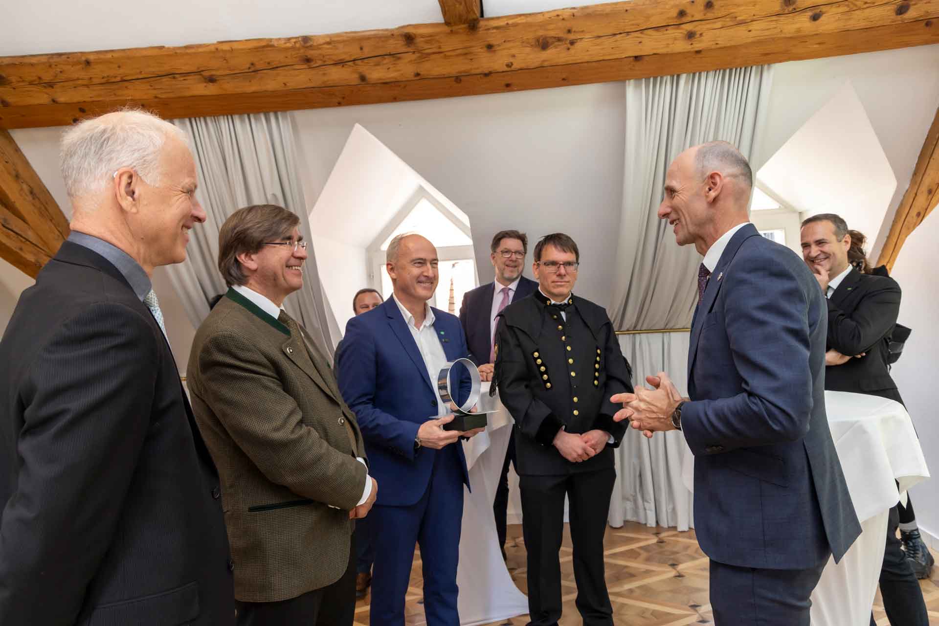 Projektleiter Jürgen Lackner, unser Geschäftsführer Heinz Mayer, Institutsdirektor MATERIALS Paul Hartmann sowie Forschungsgruppenleiter Wolfgang Waldhauser nahmen die Trophäe von Wirtschafts- und Forschungslandesrat Willibald Ehrenhöfer und SFG-Geschäftsführer Christoph Ludwig entgegen.„Der Innovationsgrad eines Forschungsunternehmens wird durch seine exzellenten Mitarbeiter*innen, die an aktuellen Herausforderungen der Wirtschaft und Gesellschaft arbeiten und in ein agiles Netzwerk aus Wirtschaft und Wissenschaft eingebunden sind sowie durch eine Top-Forschungsinfrastruktur bestimmt. Als anwendungsorientiertes Forschungsunternehmen ist es uns zudem möglich, zielgerichtet und maßgeschneidert Lösungen für die Wirtschaft und Industrie am Standort anzubieten“, so Heinz Mayer, Geschäftsführer JOANNEUM RESEARCH.