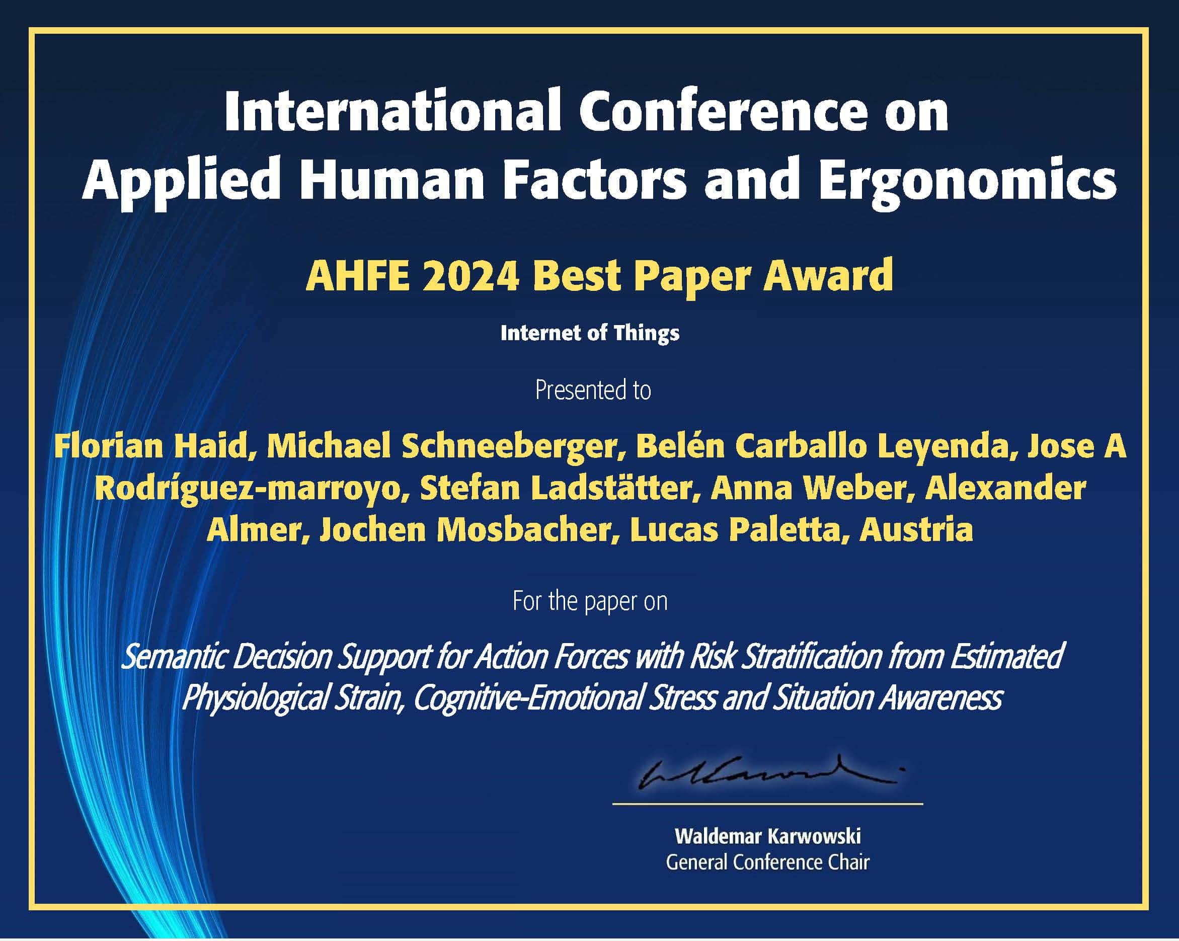 Das Institut DIGITAL hat mit seinem Human Factors Labor Team in Zusammenarbeit mit der Universidad de León einen bedeutenden Erfolg erzielt: Auf der renommierten „International Conference on Applied Human Factors and Ergonomics“ in Nizza, Frankreich, wurde das gemeinsame Forschungspapier mit einem Best Paper Award ausgezeichnet.
