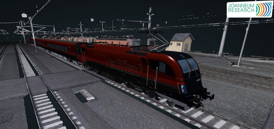 Dazu gehört die Übertragung der bestehenden Bahninfrastruktur in eine möglichst detailgetreue digitale Abbildung. Moderne Mobile-Mapping-Sensoren liefern die dazu nötigen dreidimensionalen Daten, KI-Methoden interpretieren diese Daten und fassen sie zu einzelnen Objekten wie Masten, Schienen, Schwellen zusammen. Ein solcher umfassender 3D-Zwilling kann danach mit Wartungsplänen und Inventarlisten verknüpft werden, oder dient als Grundlage für Simulationen des Bahnverkehrs der Zukunft.