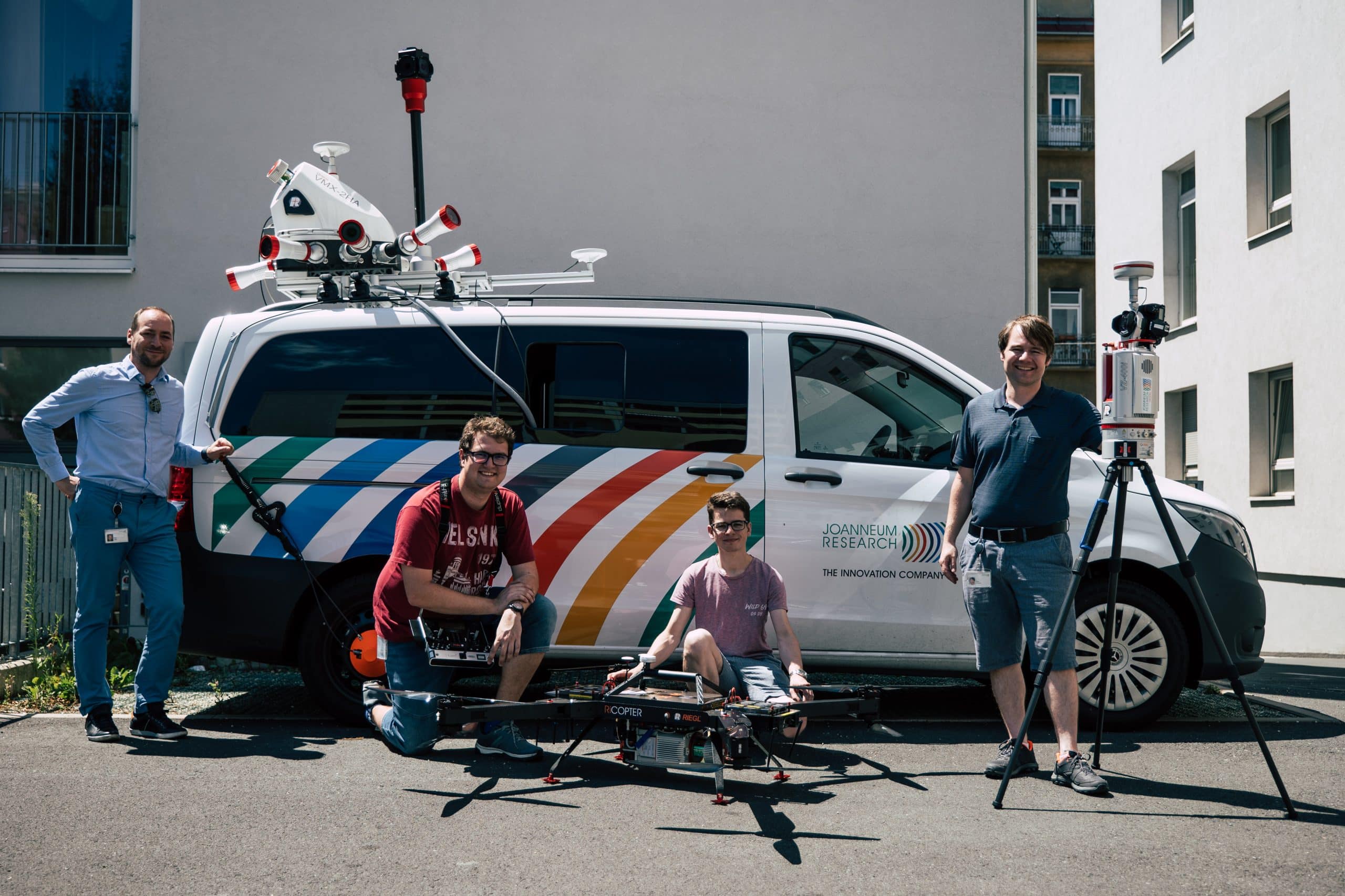 Unsere national einzigartige Forschungsinfrastruktur eignet sich zur Erstellung von räumlichen digitalen Zwillingen. Für hochgenaue Vermessung von Umgebungen werden fahrzeug- und luftgestützte und terrestrische Laserscanner eingesetzt, um Ausgangsdaten für die automatisierte Ableitung von digitalen Abbildern der Realität, 3D-Modellen und hochgenauen Referenzkarten (UHDmaps®) zu generieren.