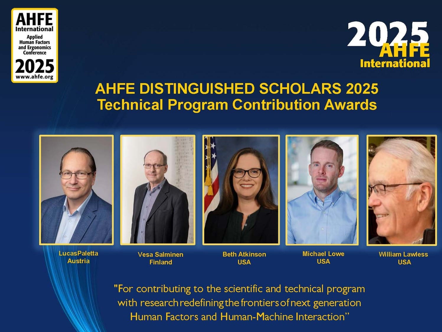 Mit dieser Auszeichnung ehrt die AHFE-Community herausragende Wissenschaftlerinnen und Wissenschaftler, die wissenschaftliche Spitzenleistungen mit exzellenter Forschung verbinden und die Werte einer internationalen, interdisziplinären Zusammenarbeit verkörpern. Lucas Paletta ist seit vielen Jahren aktives Mitglied der AHFE-Community und leitet den Track Cognitive Computing in Sociotechnical Systems. In seiner Arbeit legt er besonderen Wert auf Forschung mit realer Wirkung, den Austausch mit Kolleginnen und Kollegen aus aller Welt und die Förderung eines offenen, zukunftsorientierten Dialogs.