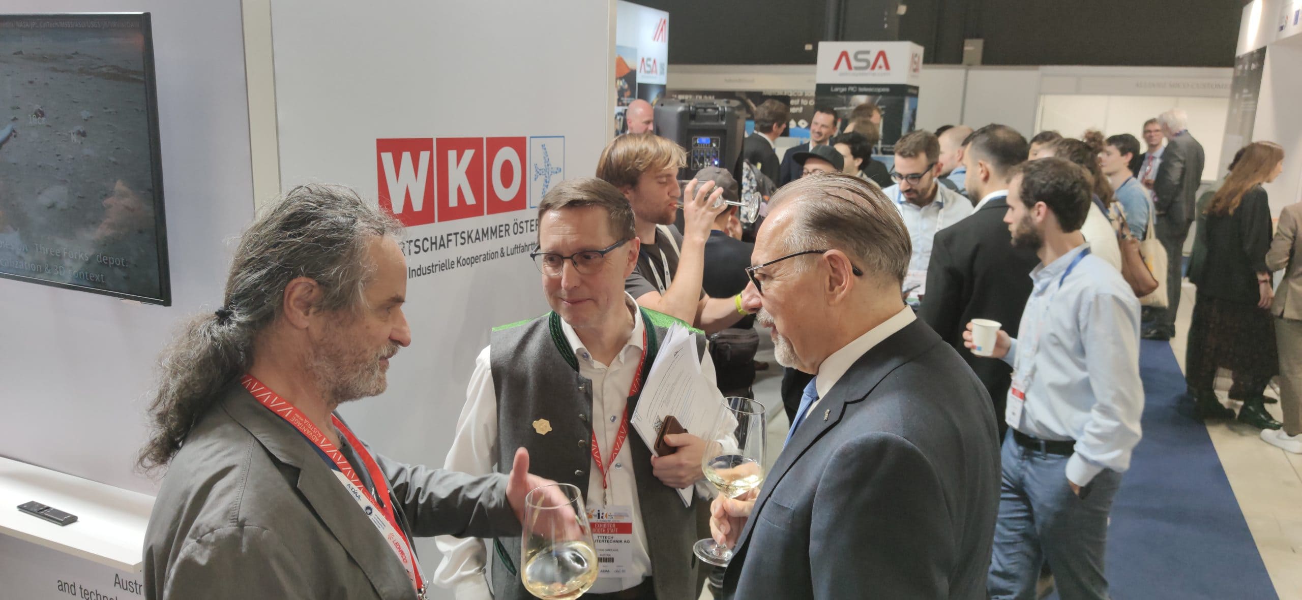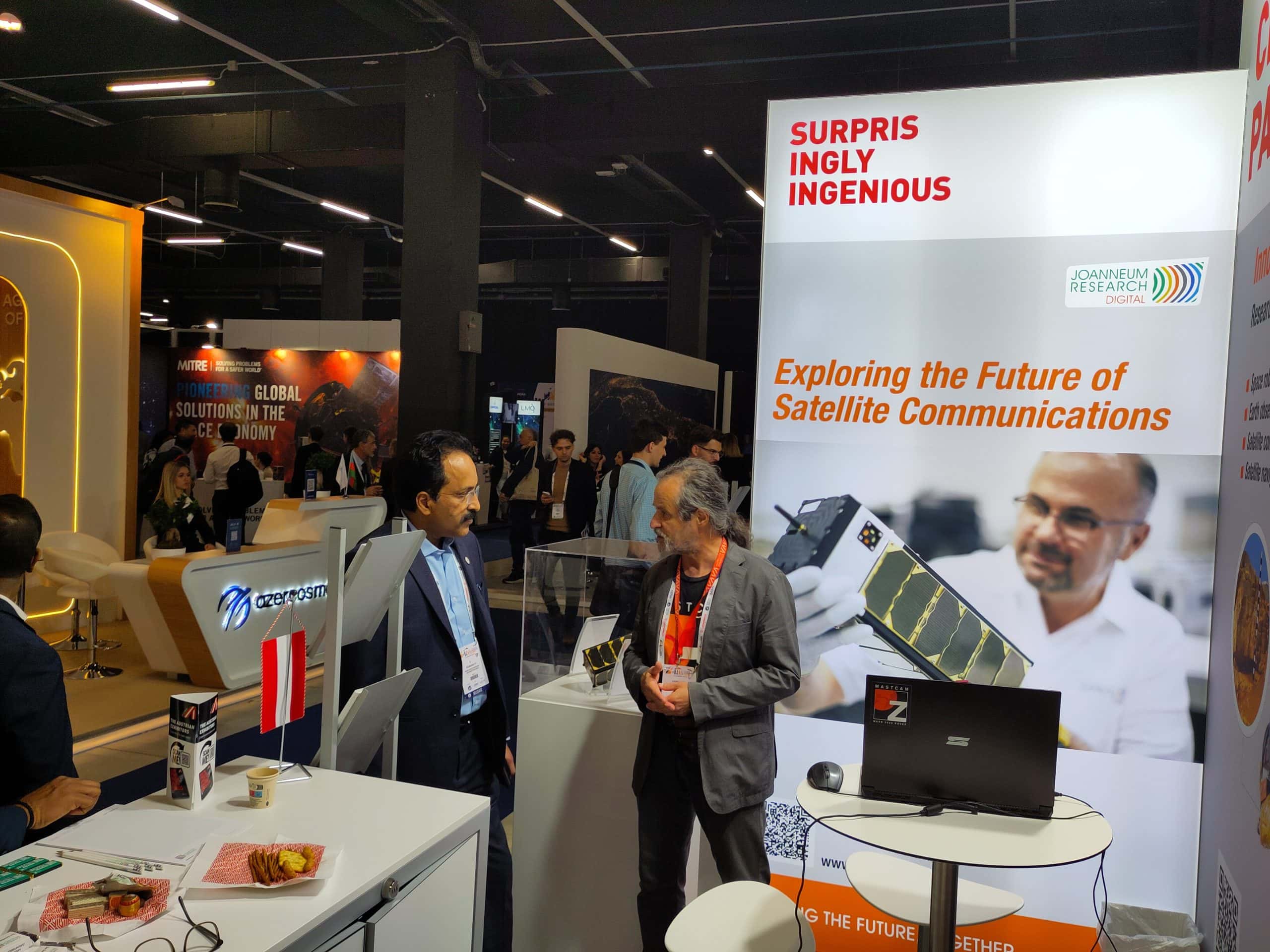 Erstmals präsentierte sich die österreichische Industrie mit einem Gemeinschaftsstand, der von der Wirtschaftskammer Österreich (WKO) organisiert wurde. Auch JOANNEUM RESEARCH DIGITAL war mit Institutsleiter Matthias Rüther und unserem Weltraumexperten Gerhard Paar vor Ort, um die neuesten Entwicklungen in den Bereichen Weltraumrobotik und Satellitenkommunikation zu präsentieren. Der Stand zog hochkarätige Besucher an, darunter den Direktor der Europäischen Weltraumorganisation (ESA), Josef Aschbacher, und die österreichische Astronautin Carmen Possnig.