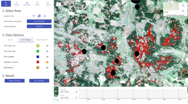 Nach Abschluss der methodischen Entwicklungen wurde vom Konsortium ein Prototyp eines satellitenbasierten Borkenkäfer-Monitoring Service eingerichtet. Forstbetriebe und Forstverwaltungen testen diesen Prototyp über ein interaktives Webportal. Unser Ziel war es, dass Forstbetriebe wichtige Maßnahmen zur Borkenkäferbekämpfung möglichst frühzeitig und gezielt in Risikogebieten planen und anwenden können. Die Einbeziehung von Forstbetrieben und Forstbüros garantiert, dass sich alle Projektentwicklungen an den tatsächlichen Anforderungen der Nutzer und des Marktes orientieren.