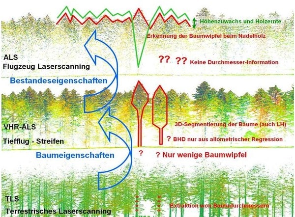 Ziel des Projekts war es, einen kosteneffizienten Workflow zur Digitalisierung des Waldes zu erarbeiten, der von der Gewinnung flugzeugbasierter Fernerkundungsdaten von mittlerer bis sehr hoher Punktdichte und deren Prozessierung über optimierte Felderhebungen mittels terrestrischen Laserscannings bis hin zu einer Tablett-Applikation zur Unterstützung des forstlichen Managements reicht.