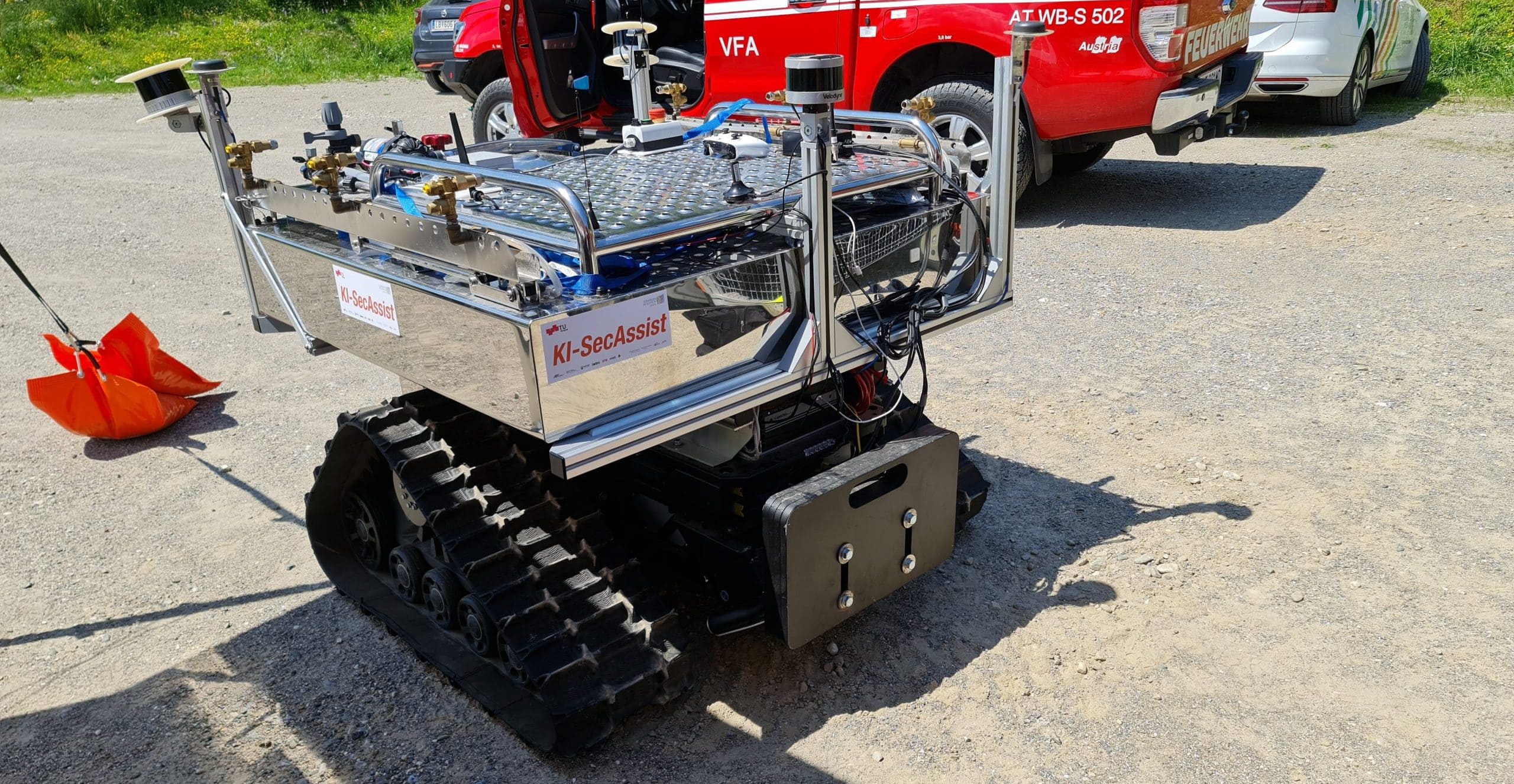 Im Projekt KI-SecAssist wurde ein modularer Demonstrator entwickelt, der den kombinierten Einsatz von UAVs und UGVs mit integrierter Multisensorik ermöglicht. Ziel war die szenarienabhängige Unterstützung von Einsatzkräften, etwa bei Wald- und Flächenbränden oder dem Schutz kritischer Infrastruktur.