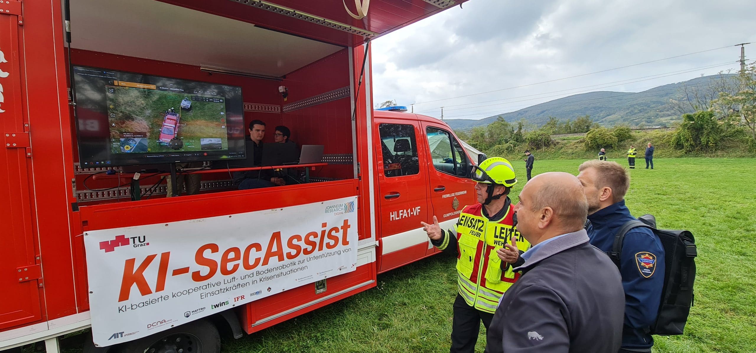 Krisen und Katastrophen nehmen zu und stellen hohe Anforderungen an Einsatzkräfte und Ressourcen. Um diese Herausforderungen besser zu bewältigen, wurde im KIRAS-geförderten Forschungsprojekt KI-SecAssist ein Funktionsdemonstrator für kooperatives Aufgabenmanagement entwickelt. Ziel war es, den kombinierten Einsatz von unbemannten Luft- (UAVs) und Bodenfahrzeugen (UGVs) zu ermöglichen. Der Demonstrator dient der Unterstützung von Einsatzkräften durch intelligente Koordination und moderne KI-Methoden. Schwerpunkt war die Erprobung neuer Assistenzsysteme zur Verbesserung der Einsatzstrategien und zur Identifikation zukünftiger Entwicklungsbedarfe.