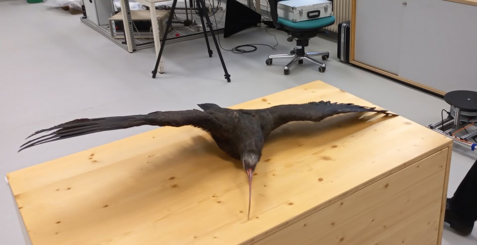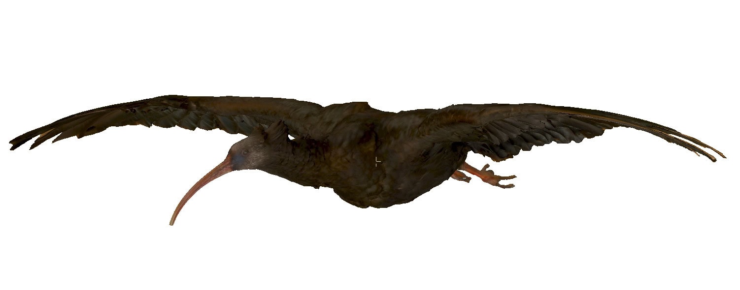 In einem Kooperationsprojekt mit dem WALDRAPPTEAM, der FH-JOANNUM zur Aerodynamik des Vogelflugs und zur aerodynamischen Optimierung von Biologging-Geräten werden darauf trainierte Tiere im Windkanal exakt vermessen. Der Einsatz von lebenden Vögeln soll aber auf ein Minimum reduziert und durch 3D-Modelle weitgehend ersetzt werden. Zu diesem Zweck haben Expert*innen der JOANNEUM RESEARCH ein ausgestopftes Waldrapp-Präparat exakt vermessen und einen digitalen Zwilling erstellt. Dadurch konnte im 3D-Druck ein 1:1 Modell erstellt werden, welches zur weiteren Grundlagenforschung herangezogen wird.