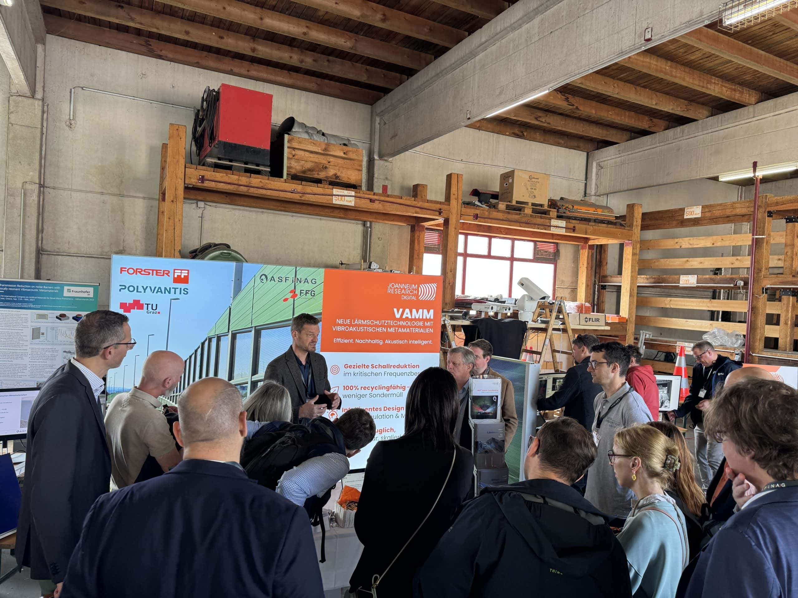Am 21. Mai 2025 war das Team der Forschungsgruppe Intelligente Akustische Lösungen von DIGITAL Teil der ASFINAG Innovations-Safari, bei der wir unser aktuelles Forschungsprojekt VAMM – Entwicklung neuartiger Lärmschutzwandelemente mit vibroakustischen Metamaterialien einem breiten Publikum aus Fachleuten, Innovationsmanager*innen und Infrastrukturverantwortlichen präsentieren konnten. In der F&E-Innovationspartnerschaft mit der ASFINAG entwickeln wir eine neue Generation von Lärmschutzwänden basierend auf akustischen Metamaterialien, die wir unter realen Bedingungen auf der Autobahn testen.