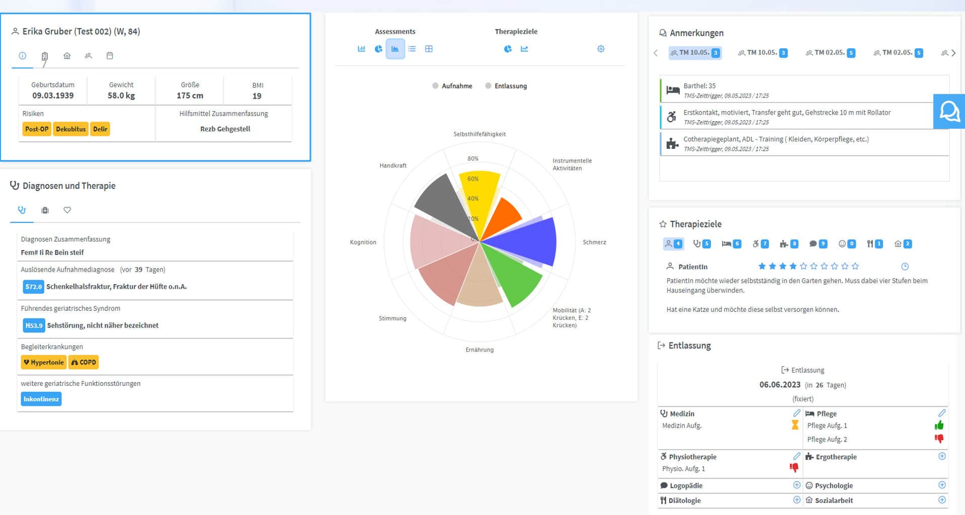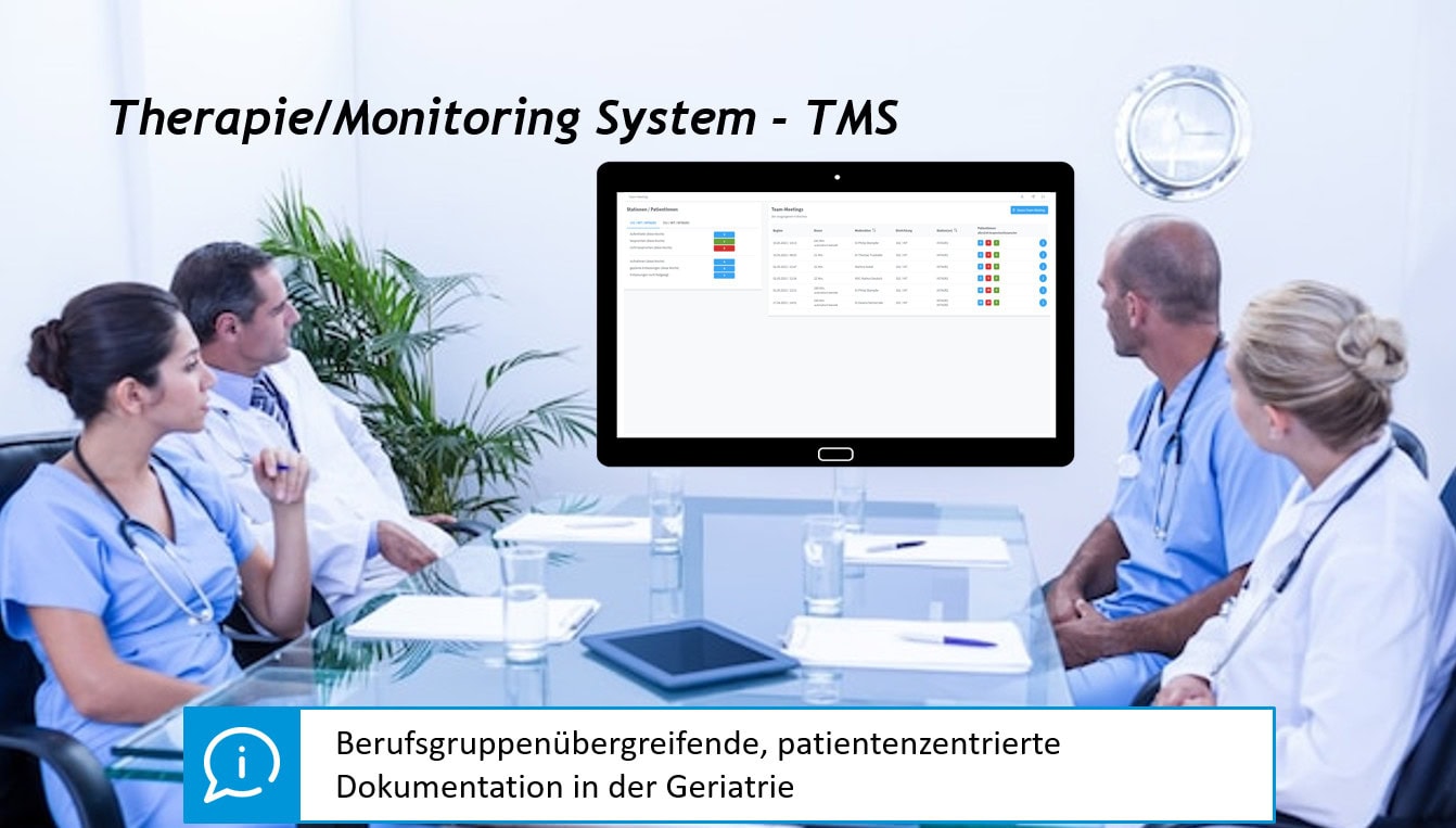 The therapy monitoring system (TMS) supports the work of interdisciplinary teams in acute geriatric clinics and was developed together with experts from the QiGG (Quality in Geriatrics and Gerontology) association. The aim is to enable structured documentation of the geriatric stay and a clear patient presentation, to support interdisciplinary team meetings and to enable automatic data transfer to the benchmarking system for acute geriatrics.