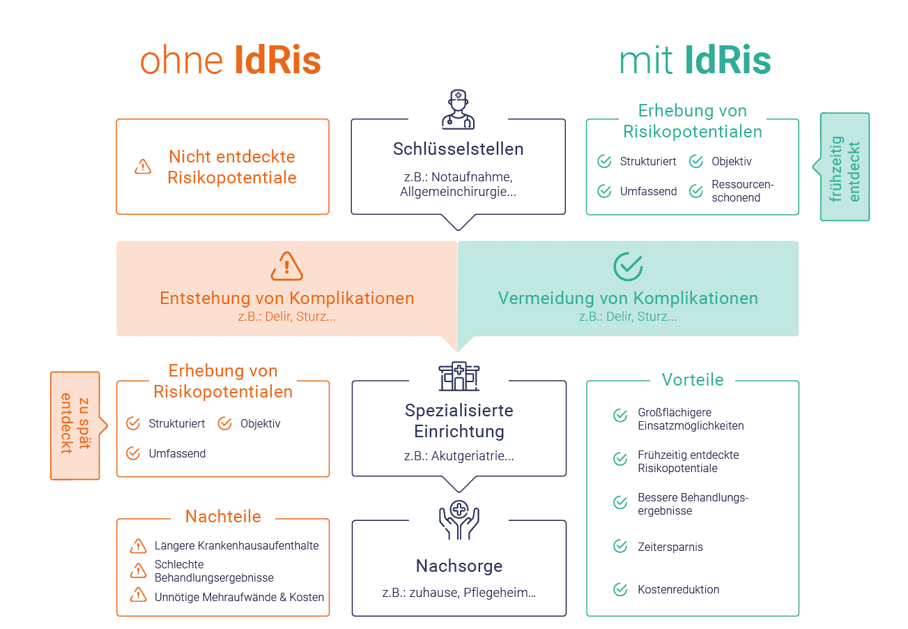 Das Projektkonsortium entwickelt eine Methode zur raschen, (teil-)automatisierten Identifikation des Risikopotenzials bei älteren Menschen durch digitale Biomarker. Diese Methode soll zukünftig an verschiedenen Schlüsselstellen der Gesundheitsversorgung zur Verfügung stehen. Dabei werden Methoden der künstlichen Intelligenz (KI) genutzt, um Risikopotenziale wie Frailty (Gebrechlichkeit), Delir (akuter Verwirrtheitszustand), Dysphagie (Schluckstörung) und Sturzneigung zu identifizieren.