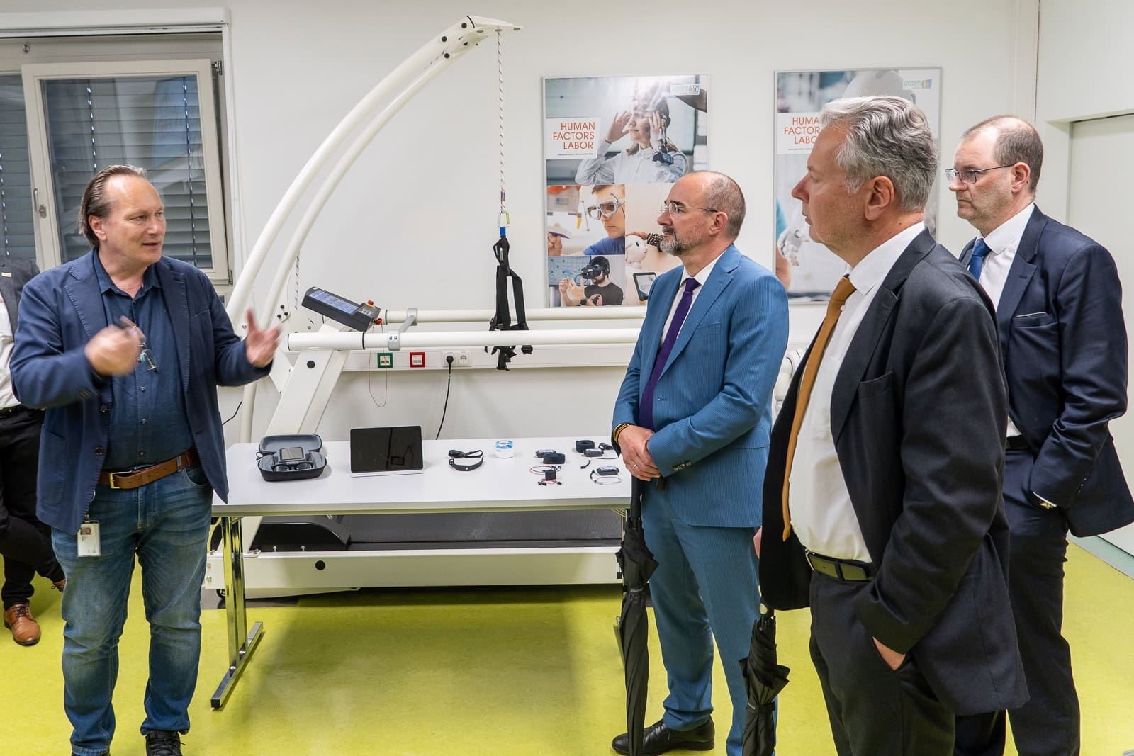 Besonderes Interesse am Institut DIGITAL galt dem Akustiklabor, in dem Prototypen zur Identifikation von Lärmquellen im Straßenverkehr sowie Lösungen zur Lokalisierung mobiler GNSS-Störquellen vorgestellt wurden. Im Human Factors Labor demonstrierten Forscher*innen digitale Biomarker zur Überwachung der psychophysischen Belastung, die beispielsweise beim Training von Einsatzkräften eingesetzt werden können.
