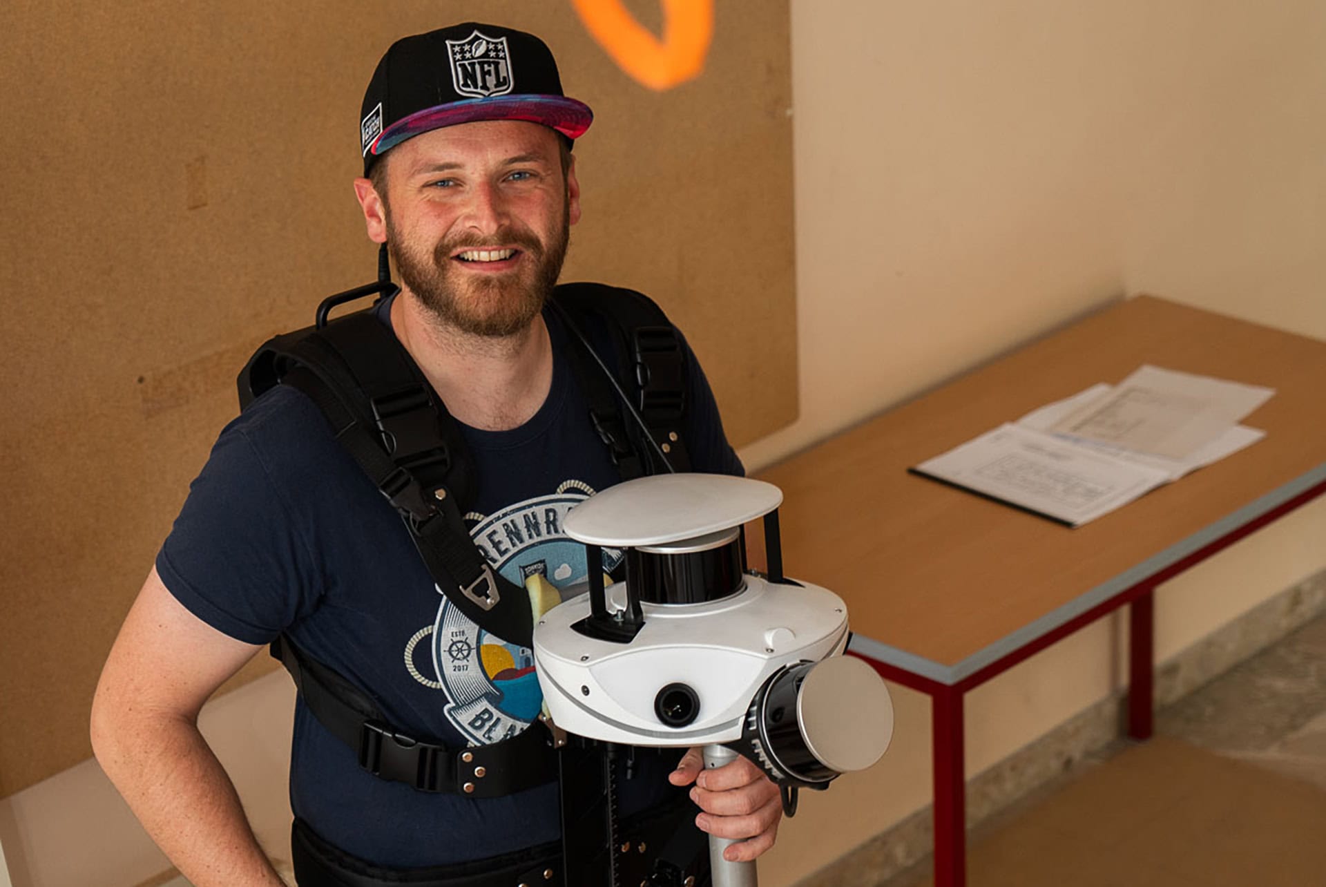 Werner Pretscher hat das Gebäude mit einem kostspieligen mobilen 3D-Scanner aus dem Digital Twin Lab der JOANNEUM RESEARCH erfasst. Dieses wird wie eine Steadycam getragen. Die Technologie liefert präzise Daten in Echtzeit und ist besonders geeignet für Bestandsbauten, wie die Josef-Rehrl-Schule, ohne aktuelle Pläne, etwa vor Sanierungen oder Umbauten.