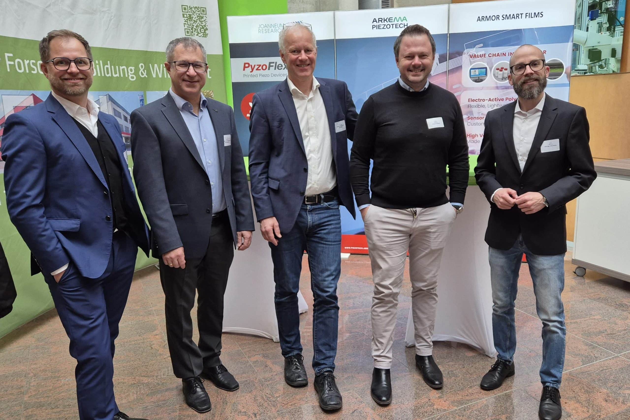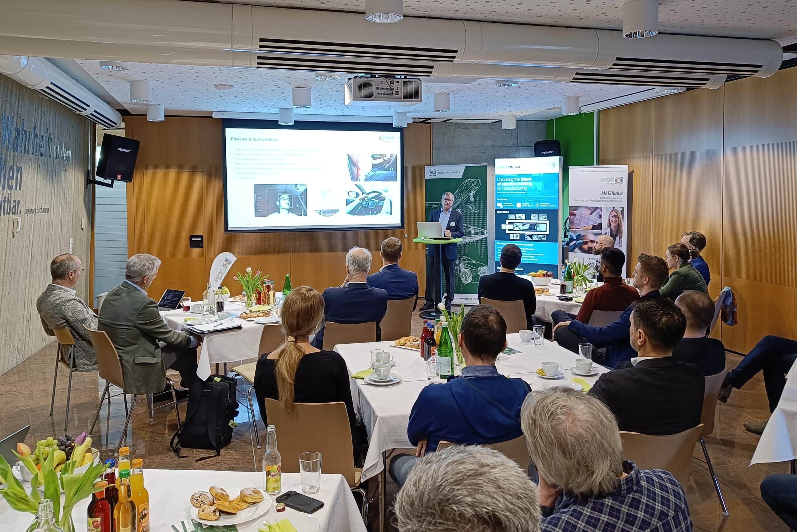 Gastgeber Paul Hartmann (JOANNEUM RESEARCH) gab einen Überblick über die neusten Entwicklungen unseres Instituts MATERIALS zur Sensorik für zeitgemäße Mobilität und spannte den Bogen von Anwendungen der Pyzoflex®-Sensorik beim Transport von Passagieren in Flugzeugen über Vibrationsmessungen zur vorausschauenden Wartung bis zu smarten Industrieböden. Die alternativen Technologien im Bereich des sichtbaren Lichts (Visible Light Technologies) mit eindrucksvollen Anwendungsbeispielen der Erfassung von Fahrzeugen in Tunnels und in Tiefgaragen stellte der Institutsdirektor im zweiten Teil des Vortrages vor. Stefan Koller (Varta Innovation GmbH) beleuchtete in seinem Vortrag die Wechselbeziehung zwischen Sensoren und Batterien, die in den gemeinsamen Projekten Smart@Surface und Smart2Go zusammen mit Expertinnen und Experten von MATERIALS und anderen Partnern erforscht wurden. Stefan Moitzi (Nanogate / HTP High Tech Plastics GmbH) berichtete über Ergebnisse des HEU-Projektes Multimold, in dem unter Koordination von MATERIALS seitens Nanogate das Hinterspritzen von PyzoFlex®, eine spezielle Methode zur Integration funktionaler Oberflächen entwickelt wird. Marcus Edward Hennecke (Infineon Technologies Austria AG) richtete mit seinem abschließenden Vortrag über das Cockpit der Zukunft den Blick auf die zukünftige Entwicklung des Fahrzeuginterieurs, wobei die Vorzüge der Infineon-eigenen Entwicklungen zur Radarsensorik eindrucksvoll vermittelt wurden.