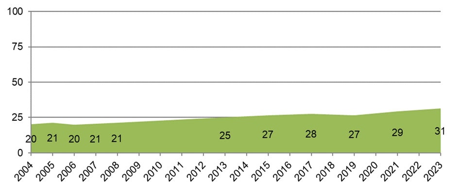 Mit einem Frauenanteil von 31 % in der außeruniversitären Forschung ist der Wert für 2023 so hoch wie nie zuvor. Besonders erfreulich: 42 % der Neueinstellungen entfielen auf Frauen, was die Bemühungen der Forschungseinrichtungen zur Förderung von Gleichstellung unterstreicht. Auch in Führungspositionen sind Fortschritte sichtbar: Der Glass Ceiling Index sank 2023 auf 1,8 (2021: 2,0), was auf bessere Aufstiegschancen hindeutet. Dennoch bleibt der Anteil von Frauen in Geschäftsführungsfunktionen mit 10 % gering.