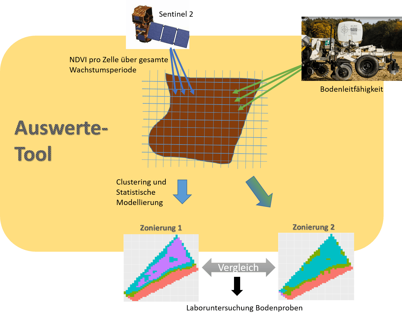 Da bei der Zonierung von Ackerflächen auch Informationen des Bodens (Ober- und Unterboden) berücksichtigt werden sollen, werden auch Bodensensordaten untersucht. Man geht von der Arbeitshypothese aus, dass durch die Kombination von Sentinel-2-Daten und Bodensensordaten eine Verbesserung der Zonierung erzielt werden kann. In diesem Zusammenhang werden die Zonierung, die nur mit Sentinel-2-Daten bestimmt werden mit der Zonierung verglichen, bei der zusätzlich noch Bodensensordaten verwendet werden. Mit den Bodensensordaten, die unter anderem die elektrische Bodenleitfähigkeit messen, ist es möglich indirekt auf die Bodenart und folglich auf die Wasserversorgung im Boden zu schließen und somit die unterschiedlichen Bodencharakteristika zu bestimmen. In der Abbildung wird die Vorgangsweise bei der Datenerhebung und die zugehörige Auswertung dargestellt.