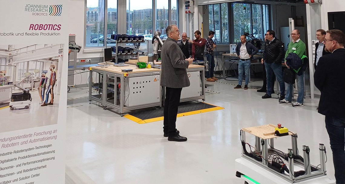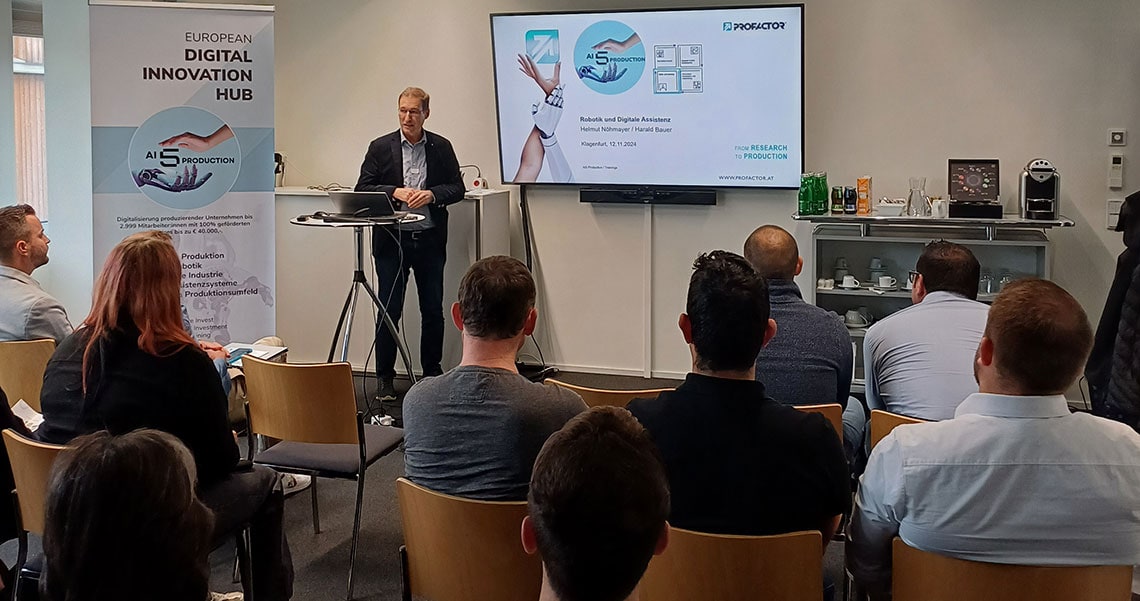 Nach der Begrüßung durch unseren Institutsdirektor Anton Scheibelmasser (ROBOTICS) und Helmut Nöhmayer (PROFACTOR) erkannten die Teilnehmer*innen, dass Digitalisierung und Robotik Klein- und Mittelbetrieben enorme Chance eröffnen, ihre Effizienz zu steigern, ihre Prozesse zu verbessern und wettbewerbsfähig zu bleiben. Um diesen Schritt in Richtung Automatisierung zu gehen, gibt es unterschiedliche Unterstützungsoptionen, welche vom DIH SÜD, AI5Production, Kärntner Wirtschaftsförderungs Fonds (KWF) sowie der Wirtschaftskammer Oberösterreich vorgestellt wurden.