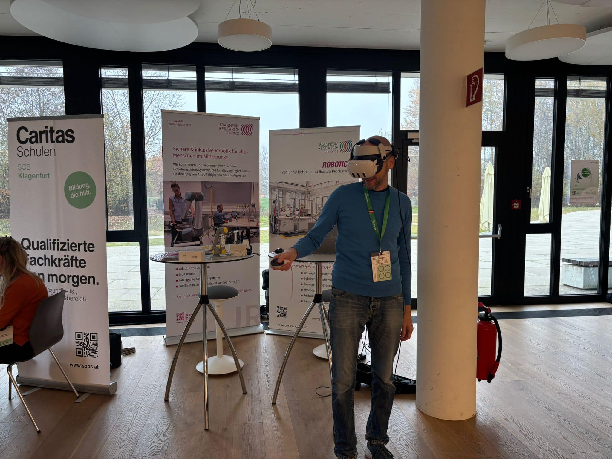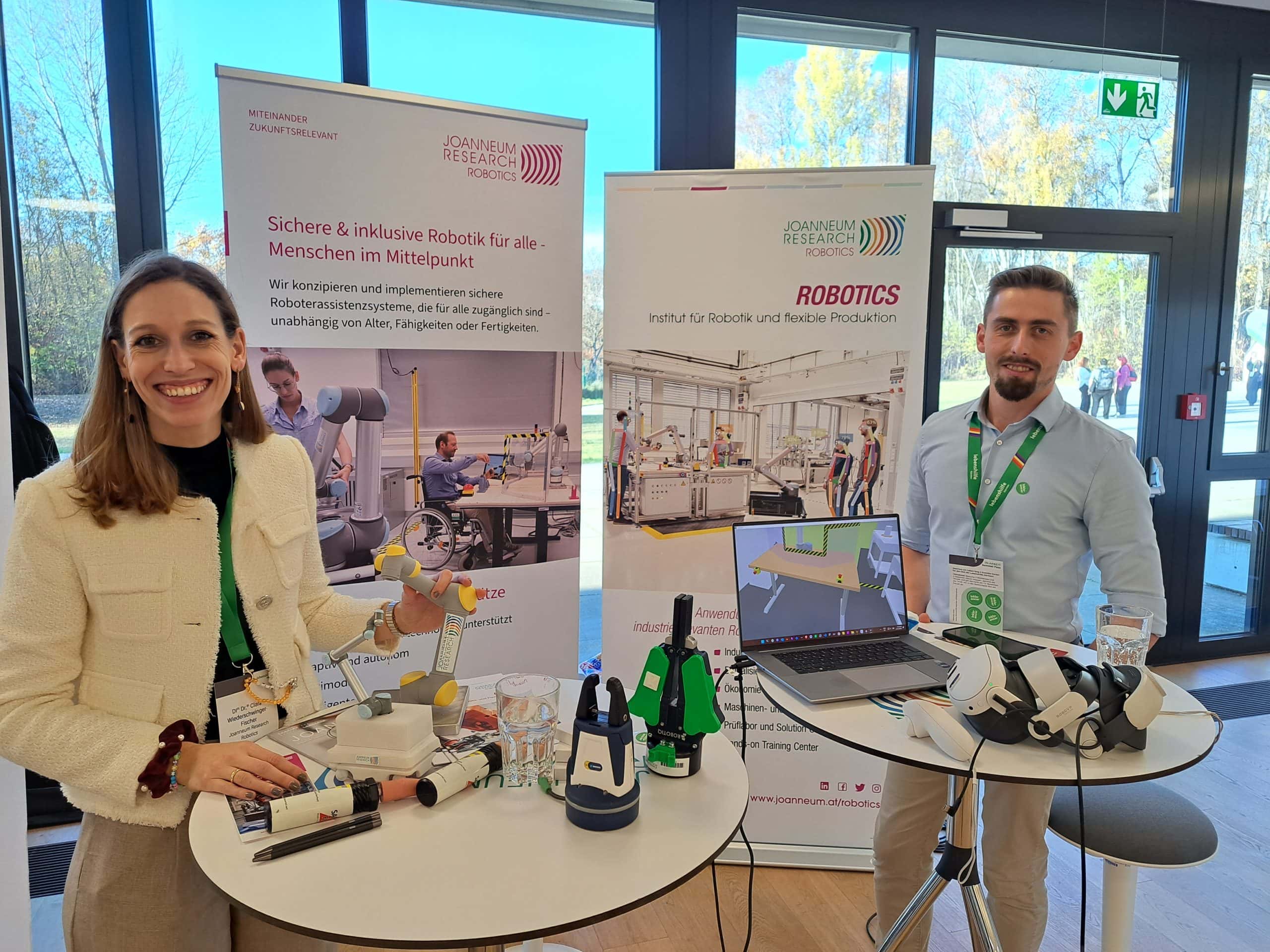 Am Stand wurde das Projekt SAFEIVERSE präsentiert, das sich damit beschäftigt, wie beeinträchtigte Menschen und Roboter in Zukunft zusammenarbeiten können. Durch Virtual Reality konnten die Teilnehmer*innen direkt in eine Arbeitsumgebung mit Robotern eintauchen und erleben, wie Assistenzroboter Arbeitsprozesse erleichtern und neue Möglichkeiten der Teilhabe schaffen. Die interaktiven Einblicke machten deutlich, dass technologische Innovation und Inklusion kein Widerspruch sind – im Gegenteil: Wenn Technologien klug eingesetzt werden, eröffnen sie Menschen mit unterschiedlichen Fähigkeiten neue Chancen im Arbeitsleben.