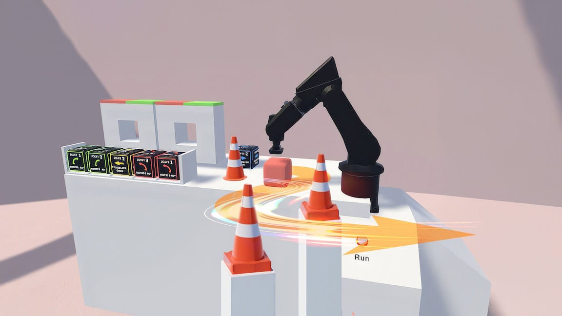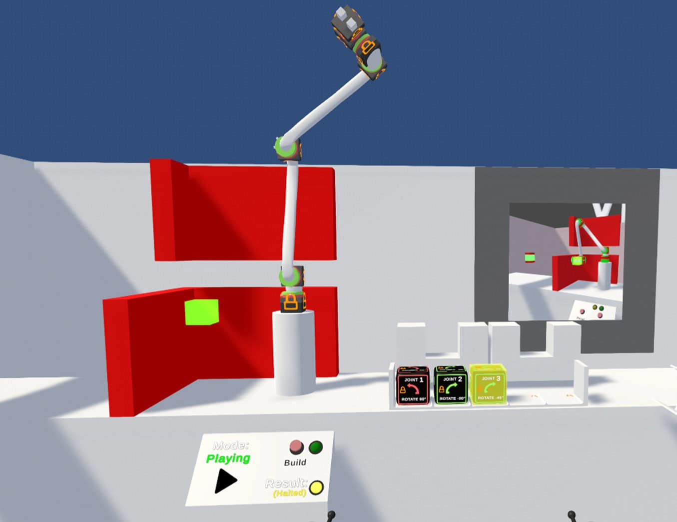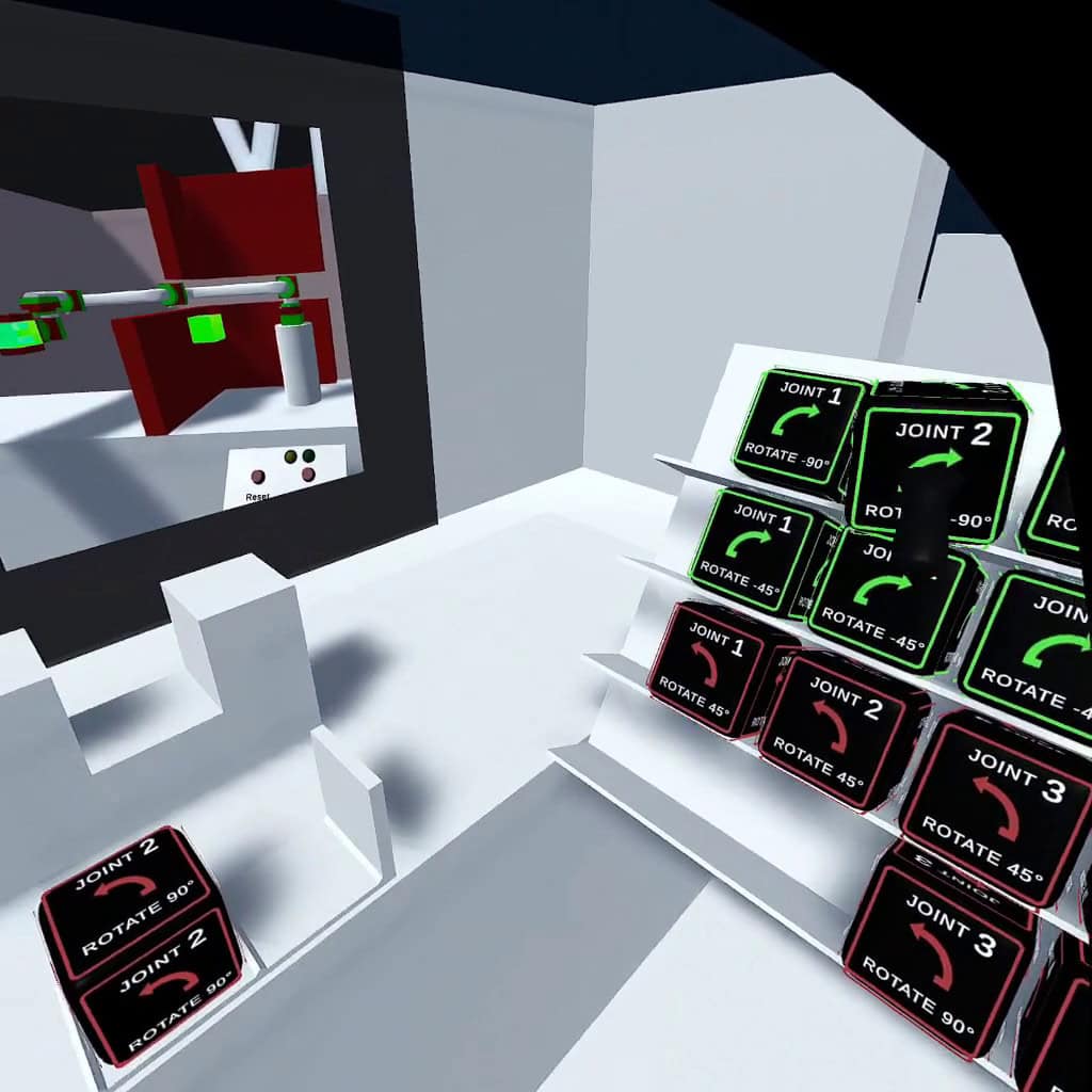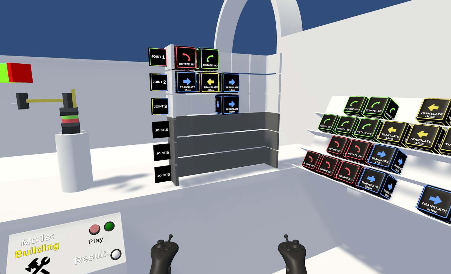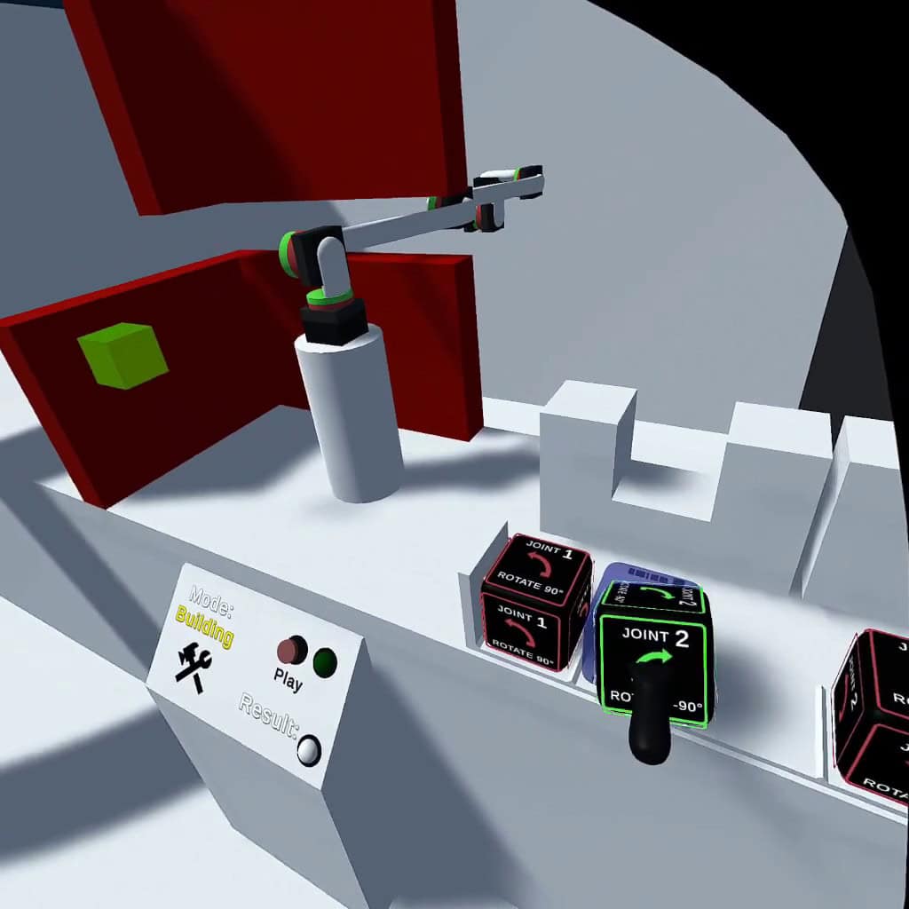 Wir entwickeln Komponenten, die es erlauben, in VR kinematisch korrekte Robotermodelle – von einfach nachvollziehbar bis hin zu industriell relevant – aus einzelnen Modulen zusammenzusetzen und durch eine leicht verständliche Programmierweise zu steuern. Dabei arbeiten wir eng mit unserem Partner Polycular GmbH zusammen, um mit unserer kombinierten Expertise didaktisch fundierte Lernpfade umsetzbar zu machen.